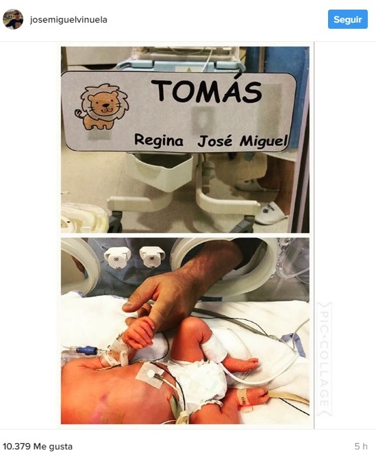 "Bienvenido al mundo Tomás Viñuela Lira. Nació el 15 de marzo a las 4:15 am de 32 semanas. Pesó 2 kilos 100 y midió 44 cm. Ahora a rezar para q se recupere las próximas semanas en la incubadora", escribió junto a una foto donde se le ve tomándole una mano.
