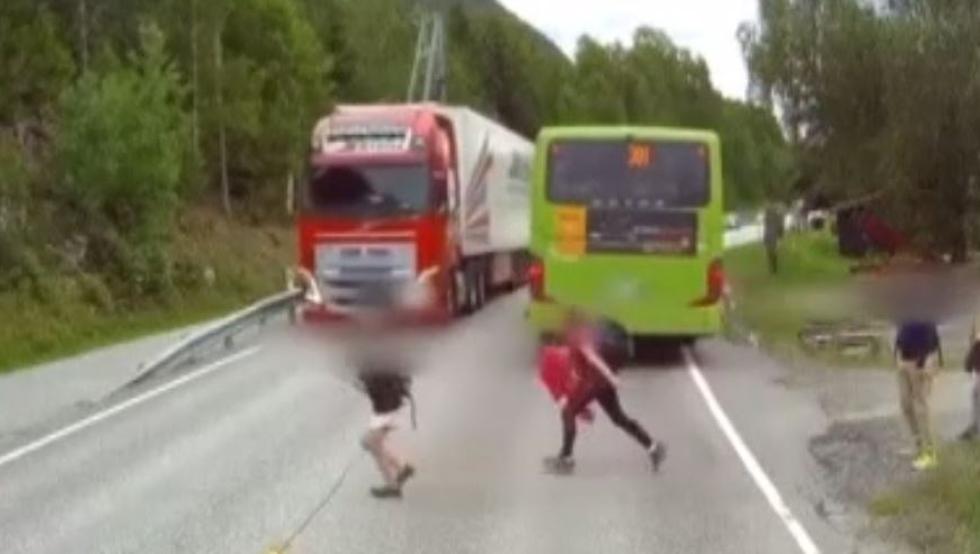 El video muestra el increíble momento en que un niño se salva de ser atropellado por un camión en Noruega. Estuvo a centímetros de la muerte luego de que cruzara un camino corriendo y sin mirar. El hecho ocurrió en Høyanger y fue captado por la cámara de seguridad de otro vehículo.