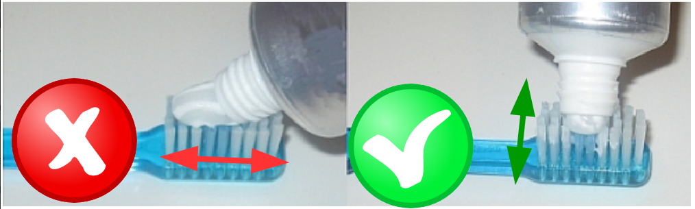 La pasta de dientes, es un "coadyuvante" del cepillo de dientes. Es por eso que se debe usar la porción correcta que es una cantidad similar a la de una lenteja. Además, se debe poner la pasta en una línea de forma transversal en el cepillo y no a lo largo.