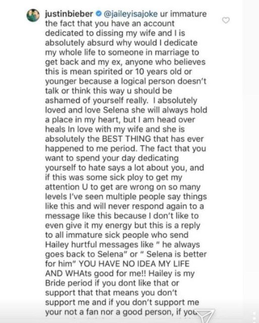 El mensaje en Instagram de Justin Bieber continuó así: "Amé y amo profundamente a Selena, ella siempre ocupara una parte de mi corazón, pero he superado eso con el amor de mi esposa y ella es absolutamente LA MEJOR COSA que me ha pasado hasta ahora. El hecho de que tú quieras pasarte el día a odiar dice mucho de ti, y si esta es tu estúpida manera de llamar mi atención te has equivocado en muchos niveles".