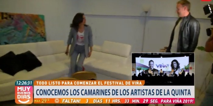 En ese contexto, los animadores del certamen, María Luisa Godoy y Martín Cárcamo, hicieron un despacho para "Muy Buenos Días" donde mostraron el camarín de la banda estadounidense. Se trata de un lugar espacioso, con un gran sillón seccional blanco y algunos cuadros.