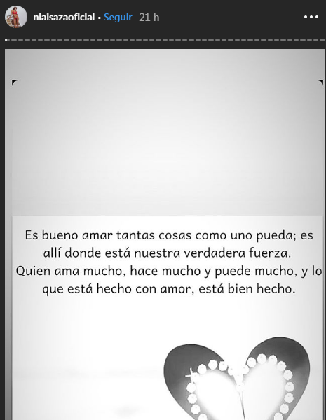 También en la misma plataforma compartió una reflexión que puso en duda a sus seguidores. "Es bueno amar tantas cosas como uno pueda; es allí donde está nuestra verdadera fuerza. Quien ama mucho, hace mucho y puede mucho, y lo que está hecho con amor, esta bien hecho", decía la imagen.