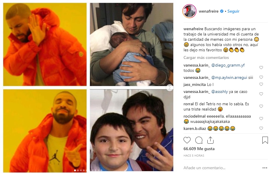 "Buscando imágenes para un trabajo de la universidad me di cuenta de la cantidad de memes con mi persona. Algunos los había visto otro no, aquí les dejo mis favoritos", fue el mensaje que escribió en la publicación que ya alcanzó sobre 66 mil "Me gusta".