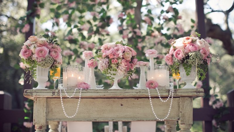 - Mobiliario: La restauración y reutilización de muebles y telas usadas es la consigna que mueve a este estilo. Por lo tanto, predominan los muebles antiguos, especialmente de madera, bronce o hierro, que se combinan sutilmente entre cortinas blancas de crepe, manteles con blonda o bordados a crochet, telas con texturas brocadas y cintas de encaje, entre otras ideas para darle atmósfera a la celebración. Asimismo, esta tendencia permite mucha manifactura propia y versatilidad y, por ejemplo, las mismas cintas de encaje que usarás para decorar las sillas, puedes también utilizarlas para enchular tus copas de novios. Eso sí, siempre respetando las tonalidades suaves, como el blanco, rosado o crema.
