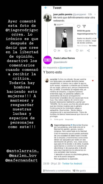 Por su parte, la usuaria Sororida, también criticó la acción de Tiago. “Ayer comenté la foto de Tiago Correa. Lo irónico es que después de decir que cree en la libertad de opinión desactivó los comentarios cuando comenzó a recibir la crítica. Todavía hay hombres haciendo esto mujeres. A mantener y resguardar nuestras luchas y espacios de personajes como este”, escribió.