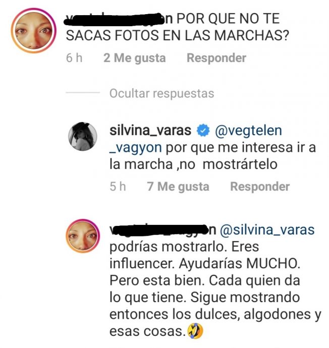 Silvina, a diferencia de otros rostros, no ha publicado en su Instagram muchos mensajes sobre las movilizaciones, sino que se ha enfocado en seguir compartiendo fotos de su trabajo como modelo. Esta situación molestó a una usuaria, quien no dudó en increparla por no compartir fotos desde las marchas.