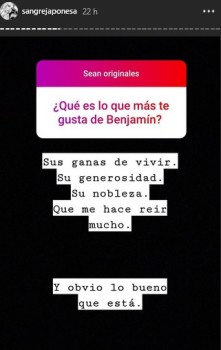 “¿Qué es lo que más te gusta de Benjamín?”, fue la interrogante en cuestión. Ante lo cual Suárez comenzó a enumerar las cualidades que más le gustan de su pareja como "sus ganas de vivir, su generosidad, su nobleza y que me hace reír mucho”.