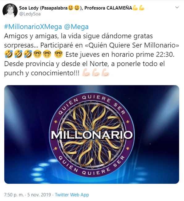 "Amigos y amigas, la vida sigue dándome gratas sorpresas", partió contando en su cuenta de Twitter para luego revelar que participará en el programa de Mega, "¿Quién quiere ser millonario?". De contestar correctamente las 15 preguntas, la profesora se llevaría $100.000.000.