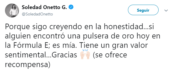 "Porque sigo creyendo en la honestidad…si alguien encontró una pulsera de oro hoy en la Fórmula E, es mía. Tiene un gran valor sentimental…Gracias. (Se ofrece recompensa)”, fue lo que escribió a través de su Twitter.