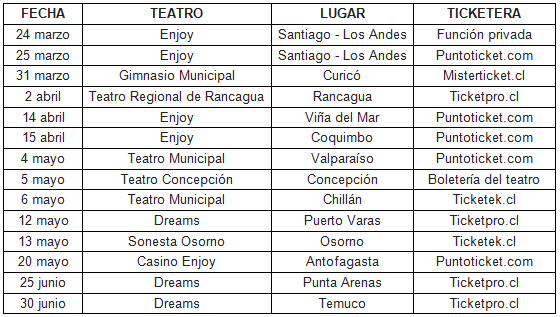 El montaje tendrá su avant premiere el 24 de marzo a las 22:00 horas en el Casino Enjoy de Los Andes. Luego vendrá un extenso recorrido de la obra por ciudades como Curicó, Viña del Mar, Coquimbo, Concepción y Antofagasta, entre otras.