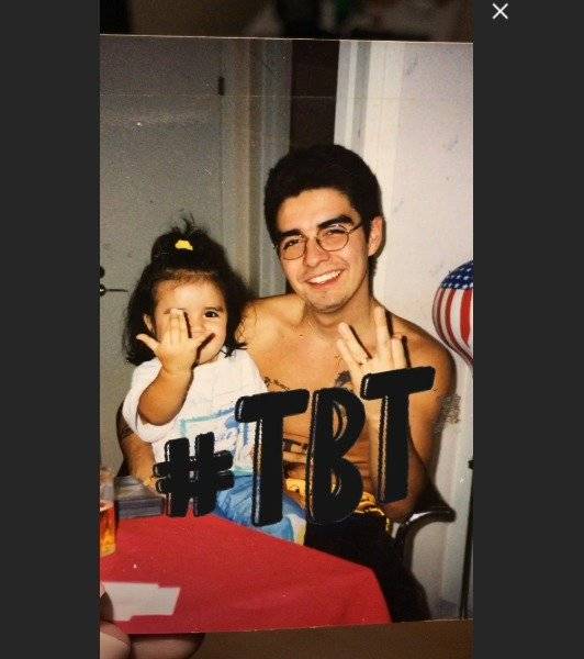 La joven, ahora de 23 años, aparece con varios años menos, como una tierna niña sentada en regazo de su papá, que llama la atención por su frondoso pelo y lentes ovalados, distinto al look al que nos tiene acostumbrados.