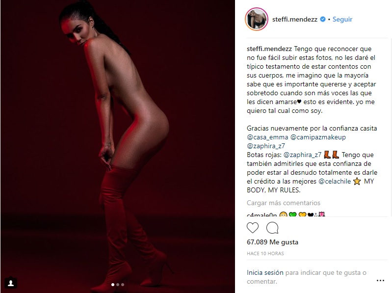 "Yo me quiero tal cual como soy. Gracias nuevamente por la confianza (...) Tengo que también admitirles que esta confianza de poder estar al desnudo totalmente es darle el crédito a las mejores @celachile", escribió Steffi para acompañar las imágenes.