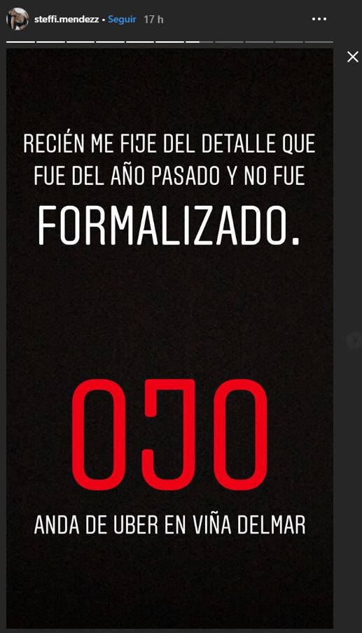 Eso sí, Steffi decidió alzar la voz y además adjuntar una foto del personaje que la amenazó. "Recién me fijé del detalle que fue el del año pasado y no fue formalizado. Ojo, anda de Uber en Viña del Mar”, compartió.