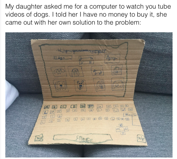 “Mi hija me pidió un computador para ver videos de perros. Le dije que no tenía dinero para comprarla y ella salió con su propia solución al problema”, escribió una madre en la red social Reddit.