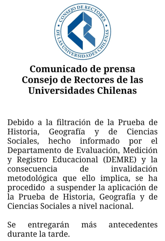 "Debido a la filtración de la Prueba de Historia, Geografía y de Ciencias Sociales, hecho informado por el Departamento de Evaluación, Medición y Registro Educacional (DEMRE) y la consecuencia de invalidación metodológica que ello implica, se ha procedido a suspender la aplicación de la Prueba de Historia, Geografía y de Ciencias Sociales a nivel nacional", señalaron en un comunicado de prensa.