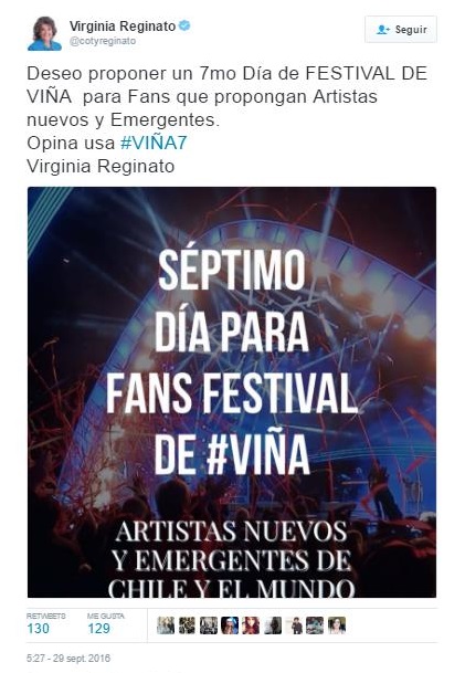 "Amigos, quiero proponer a los fans del Festival de Viña de Chile y el mundo algo que los beneficiará directamente", expresó Reginato. Es así que los fanáticos deben responder qué artista nuevo les gustaría ver sobre el escenario.