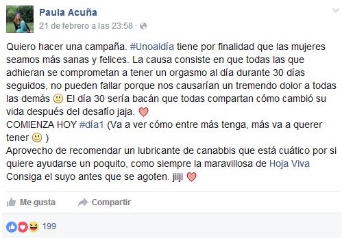 Facebook da para mucho ¿Verdad? A través de él podemos comunicar diferentes mensajes e ideas y así quiso hacerlo Paula Acuña, quien decidió publicar un desafío para las mujeres, invitándolas a vivir un orgasmo diario con el fin de mejorar la calidad de vida de todos.