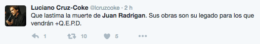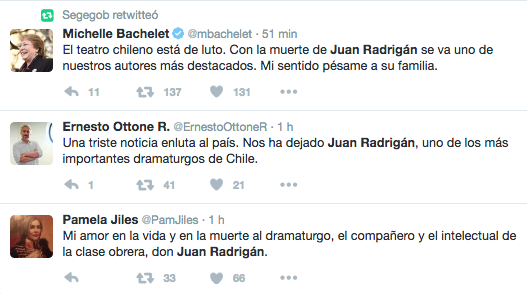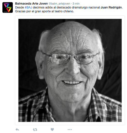 “Una triste noticia enlutece al país. Juan Radrigan uno de los más importantes dramaturgos de nuestro país nos ha dejado”, escribió la autoridad en Twitter.
