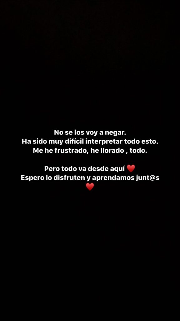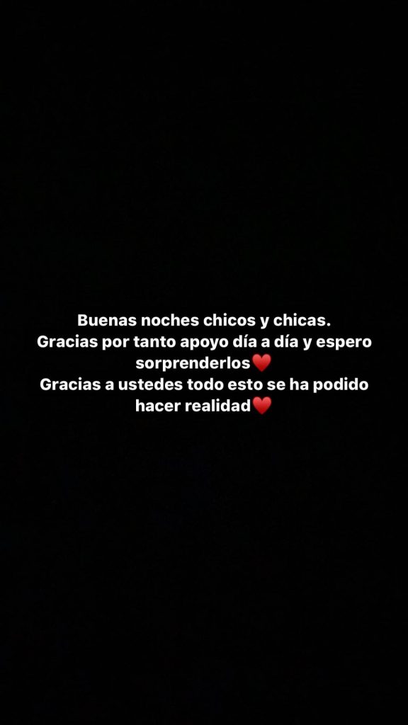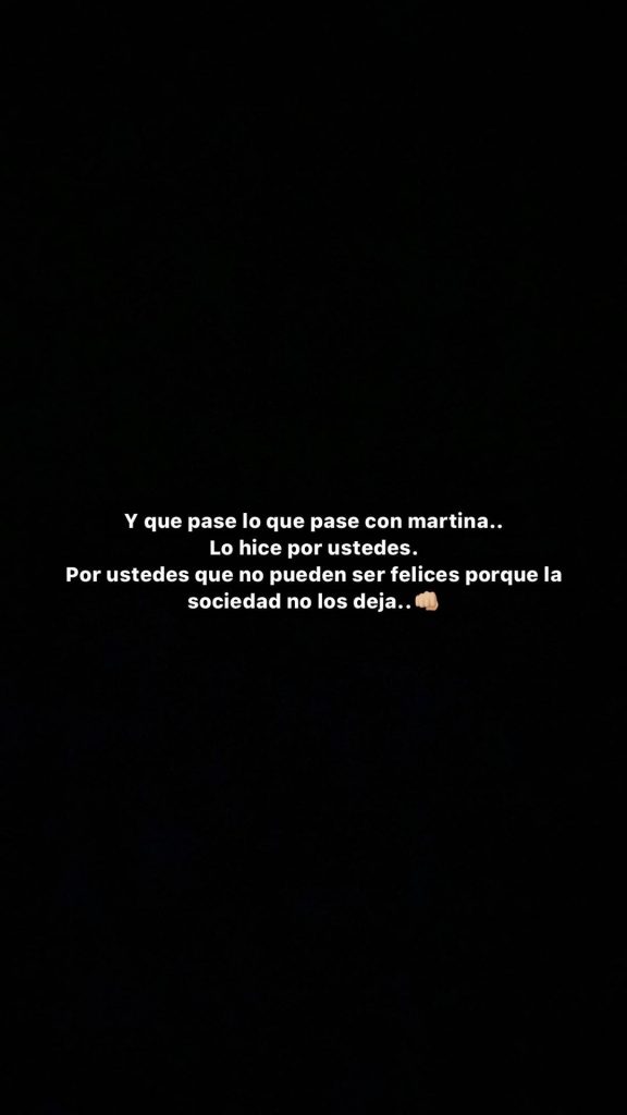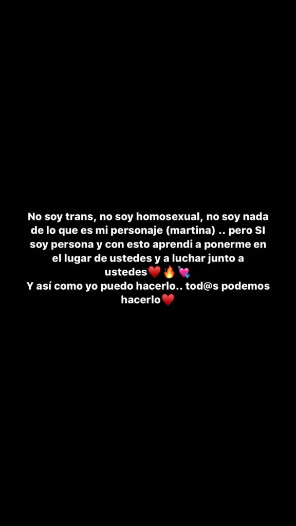 En sus historias de Instagram escribió varias frases, dentro de la que destaca: "Quiero luchar por toda esa gente que ha sido discriminada, quiero ser la cara de toda esa gente que no es escuchada quiero ser la persona que haga un llamado a que se normalice todo esto y el que ser TRANS no es una enfermedad".
