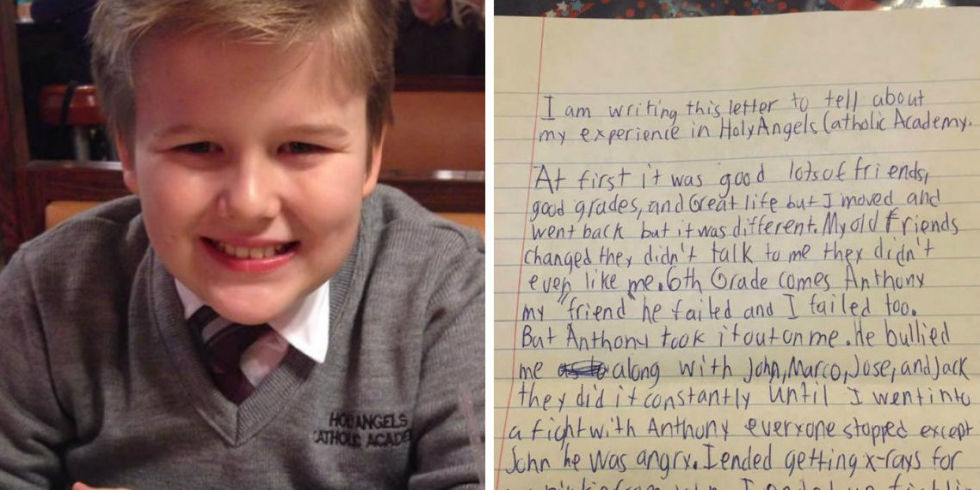 "Al principio estaba bien. Tenía muchos amigos, buenas notas y una buena vida, pero todo cambió. Mis antiguos amigos cambiaron. Dejaron de hablarme y yo dejé de caerles bien. El sexto curso llegó y mi amigo Anthony me falló y yo le fallé a él. Antony la tomó conmigo y me acosó con John, Marco, Jose y Jack. Lo hacían constantemente hasta que me peleé con él. Acabé con un meñique roto", dice otro de los párrafos.