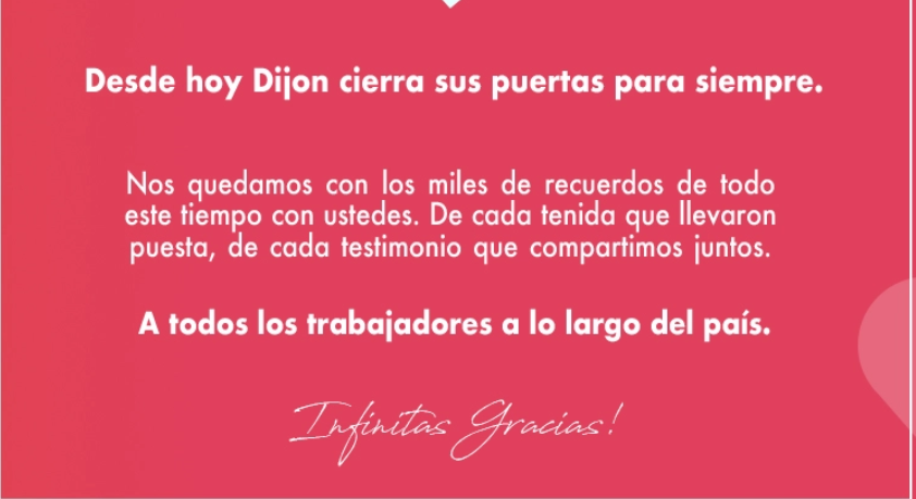 'AD Retail puso término definitivo a las operaciones comerciales de Dijon con el cierre de sus últimas cuatro tiendas. Esta decisión fue parte de un proceso ordenado de cierre que se inició en el mes de enero de este año, luego de no encontrar un modelo de negocios adecuado que diera sustentabilidad en el tiempo al negocio de venta de vestuario', indicaron en un comunicado.