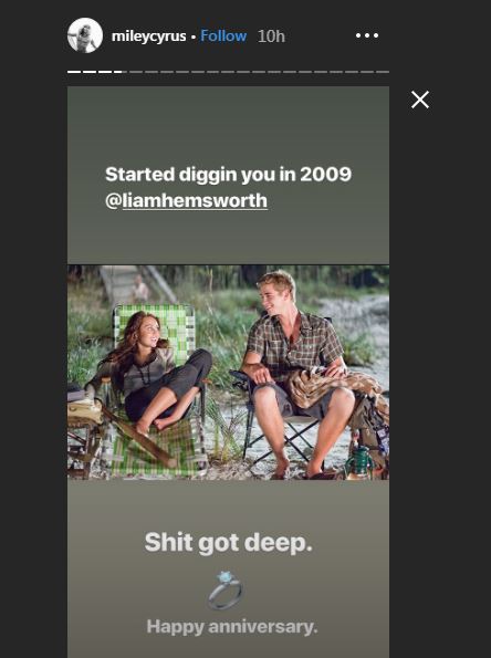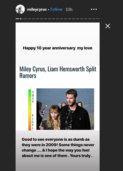 Por lo mismo, la intérprete de "Wrecking Ball" quiso rendirle tributo a su amor con Liam de una manera bastante particular y tierna. Miley compartió en sus historias de Instagram una imagen de una de las tantas noticias que hablaban sobre rumores de separación.