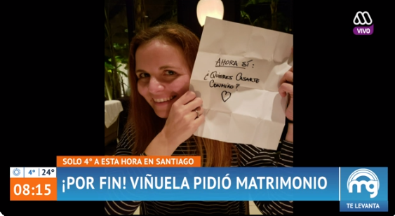 El conductor de "Mucho Gusto" reveló que para realizar la propuesta planeó un viaje a Buenos Aires, Argentina. El mismo lugar donde le pidió pololeo en 2013. En esa ocasión Viñuela le entregó un papel por debajo de una botella de champaña que decía: ¿Quieres pololear conmigo?".