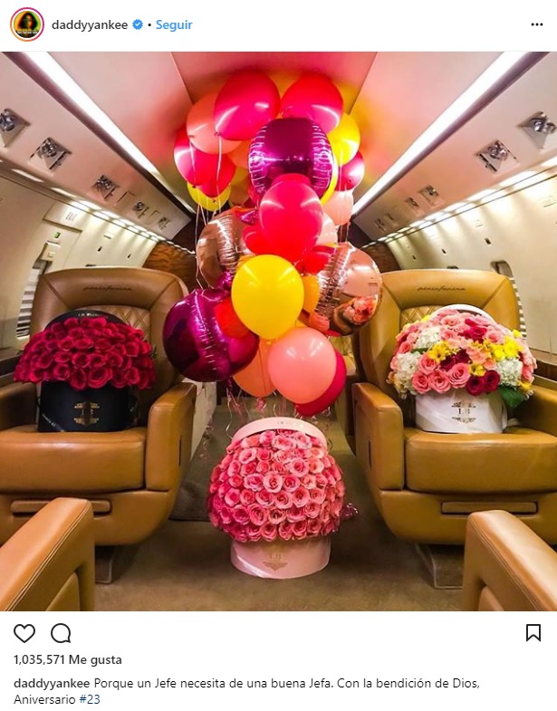 Para eso, sorprendió en sus redes sociales con una fotografía de su regalo de aniversario: unos enormes ramos de rosas de todos colores saliendo de unas elegantes cajas y muchos globos en tonos rosa, amarillo y plata, todo adornado especialmente para la ocasión. "Porque un Jefe necesita de una buena Jefa. Con la bendición de Dios, Aniversario #23", escribió el puertorriqueño junto a la imagen publicada en su cuenta de Instagram.