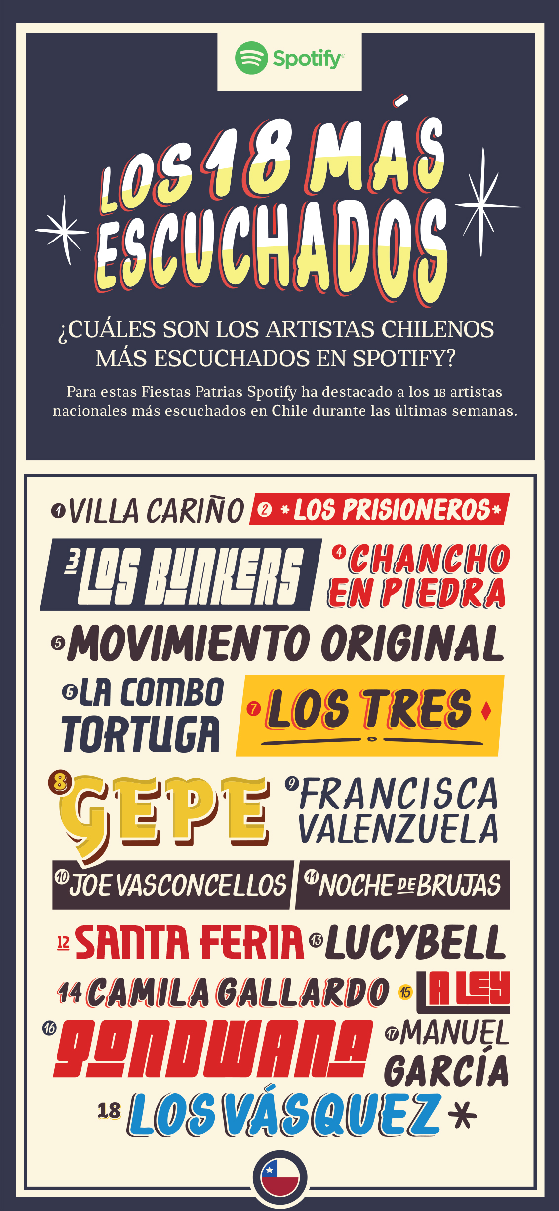 La plataforma de streaming musical Spotify hizo un ránking de los 18 artistas nacionales más escuchados en Chile durante las últimas semanas: