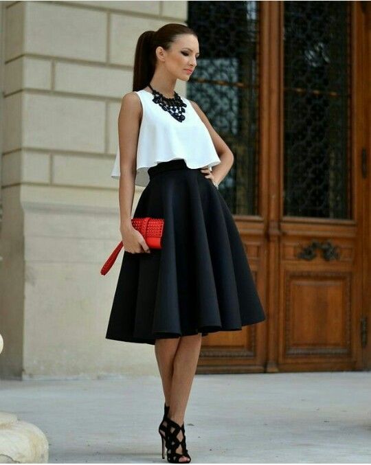 2-Falda Campana: Una falda o vestido ajustado a la cintura con caída amplia y estructurada, es ideal para quienes quieren disimular las caderas o muslos anchos.