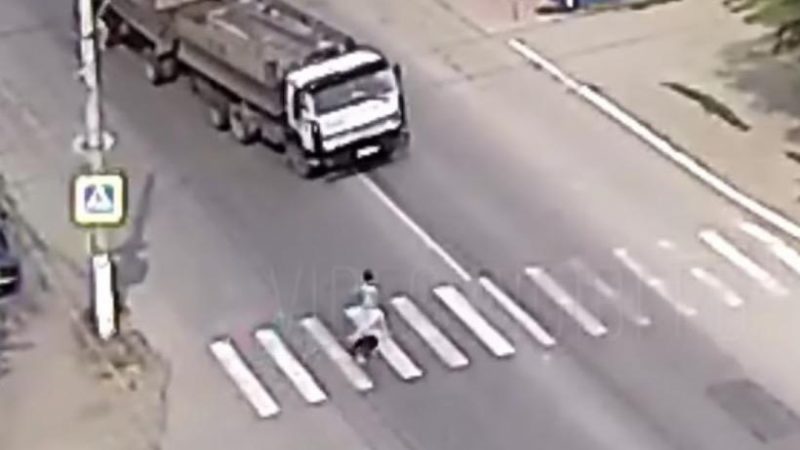 En el video se puede ver a un perro cruzando un paso de cebra junto a su dueña que camina totalmente distraída. En ese momento, un camión se acerca a toda velocidad sin tiempo para poder pisar el freno y parar. El perro se da cuenta de la velocidad del camión y para en seco tirando de la correa para que su dueña también pare de caminar.
