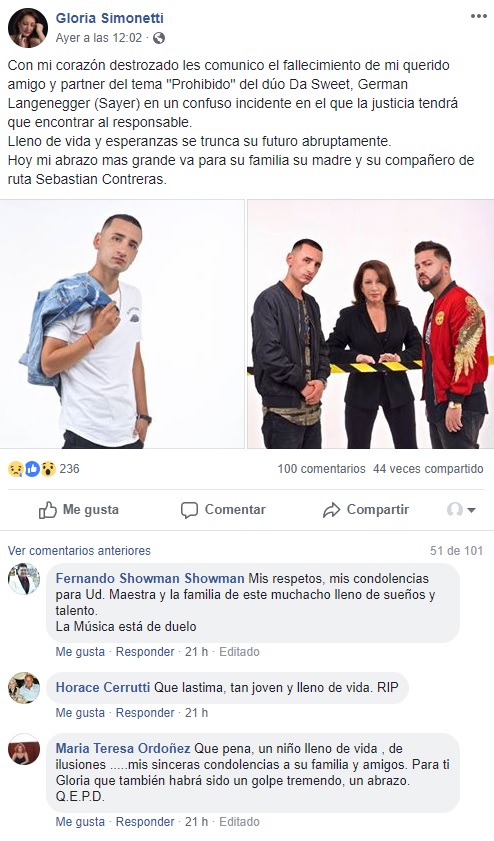 "Sayer" se encontraba trabajando con la intérprete Gloria Simonetti en una canción, y fue ella misma quien confirmó la muerte del reguetonero. "Con mi corazón destrozado les comunico el fallecimiento de mi querido amigo y partner del tema "Prohibido" del dúo Da Sweet, German Langenegger (Sayer) en un confuso incidente en el que la justicia tendrá que encontrar al responsable. Lleno de vida y esperanzas se trunca su futuro abruptamente.Hoy mi abrazo mas grande va para su familia su madre y su compañero de ruta Sebastian Contreras", comentó la artista chilena en su página de Facebook.