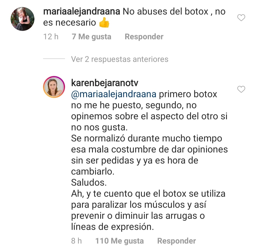 'Primero, bótox no me he puesto, segundo, no opinemos sobre el aspecto del otro si no nos gusta. Se normalizó durante mucho tiempo esa mala costumbre de dar opiniones sin ser pedidas y ya es hora de cambiarlo'.