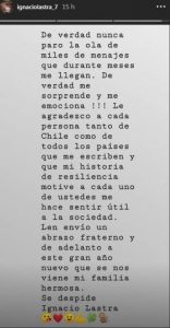 "De verdad nunca paró la ola de miles de mensajes que durante meses me llegan. De verdad me sorprende y me emociona. Le agradezco a cada personas tanto de Chile como de todos los países que me escriben y que mi historia de resiliencia motive a cada uno de ustedes me hace sentir útil a la sociedad”, escribió en su cuenta de Instagram por medio de una historia.