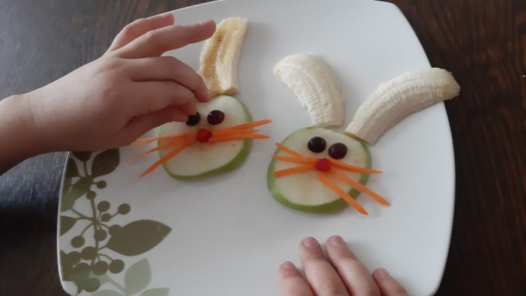 Lo primero que hay que hacer para que esta receta quede perfecta, es lavar muy bien todas las frutas. Una vez que estén completamente secas, se debe cortar la manzana por la mitad y luego en rodajas o láminas muy delgadas (serán la cara del conejo), trozar el plátano por la mitad, luego cada mitad partirla en dos (serán las orejas del conejo). Para el bigote, cortar bastoncitos de zanahoria, los ojos serán los arándanos o moras y la boca será un berrie o una frutilla trozada. Una vez esté cortada toda la fruta, montar en un plato dándole forma a la cara del conejo.