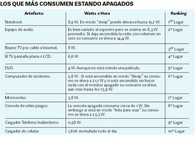 Un estudio desarrollado por el Lawrence Berkely National Laboratory del Departamento de Energía de Estados Unidos, realizó un ranking con el consumo por hora promedio en watts (W) de todos aquellos dispositivos mientras están apagados, de un número variable de modelos probados para la investigación. A continuación el resultado.