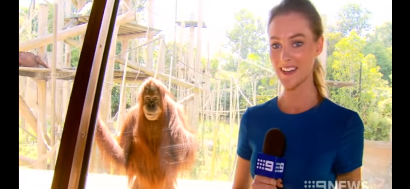 Cuando una periodista de 9News explicaba sobre la idea que tuvo el zoológico de ponerle videojuegos a los primates, para que jugaran y así no se aburrieran, detrás de ella apareció un simio.