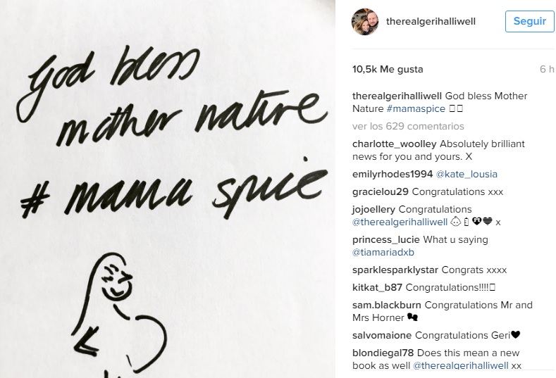 ¡Una nueva integrante de las Spice Girls viene en camino! Así lo confirmó la misma Geri Halliwell de 44 años, la colorina y audaz Spice, a través de su cuenta de Instagram junto con el mensaje "Dios bendiga a la Madre Naturaleza".