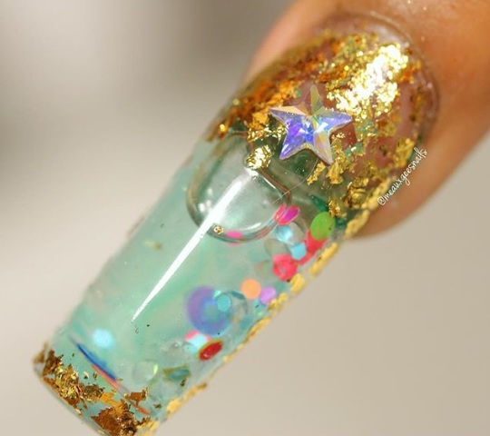 O sea, el objetivo es hacer una capa de uña rellena de líquido con brillo, glitter, purpurina, canutillos pequeños y todo lo que se te ocurra para crear un movimiento oscilante de los objetos agregados, simulando un acuario.