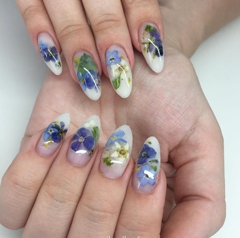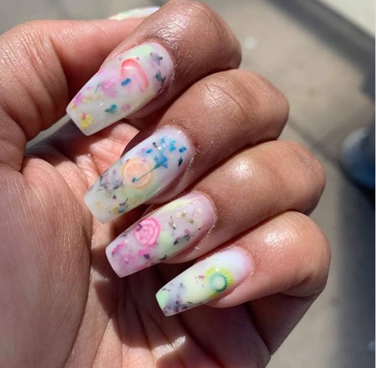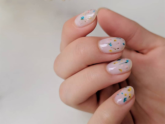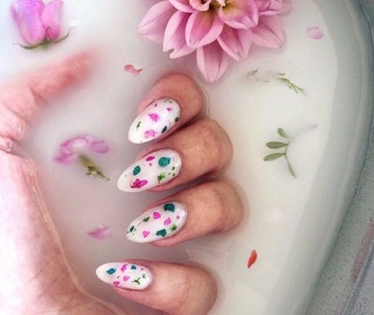 Se trata de las uñas milk bath o manicure de baño de leche, que no es otra cosa que uñas acrílicas de color blanco o crema, con diminutas flores secas de colores incrustadas.