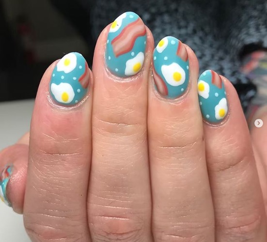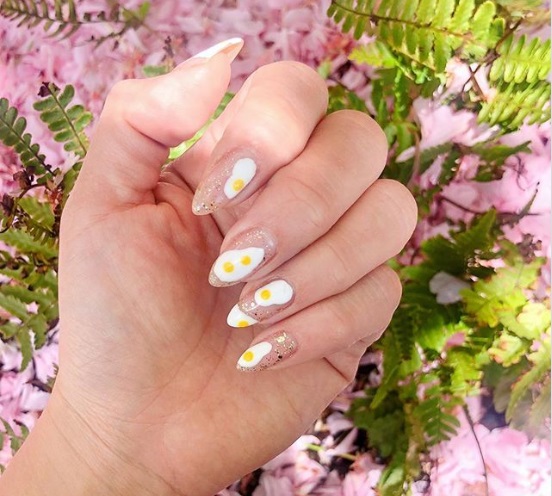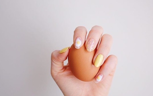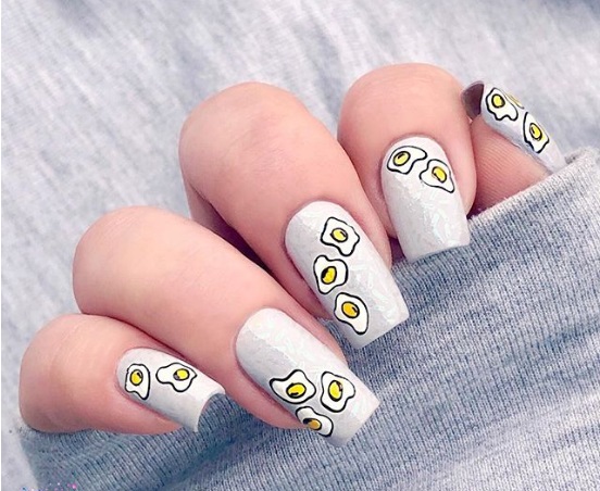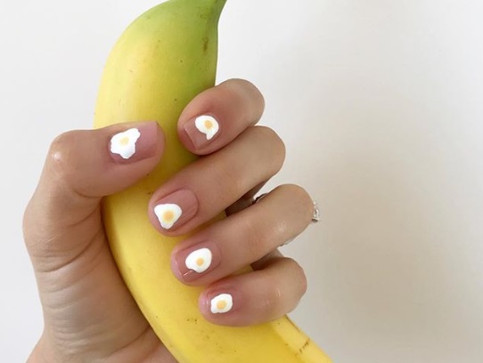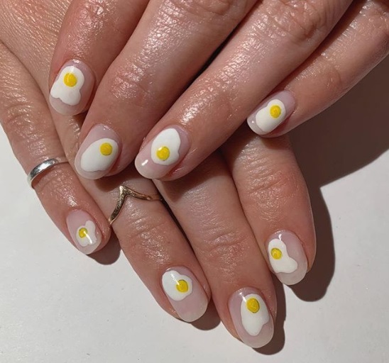 Uñas Huevo, precisamente porque la propuesta consiste en incorporar el dibujo de un huevo frito en sus habituales colores blanco y amarillo.