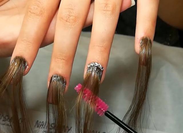 Extensiones de cabello para uñas acrílicas son la última tendencia en nail art.