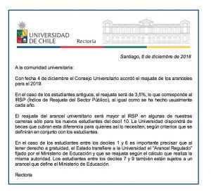 La Rectoría y la Federación de Estudiantes de la institución (FECh) explicaron a la comunidad universitaria que el alza para los alumnos antiguos corresponde al denominado Indice de Reajuste del Sector Público.