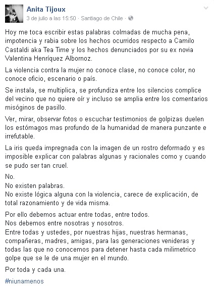 El mundo de la música se conmocionó tras las graves acusaciones que enfrenta Camilo Castaldi -agresión física, abuso de drogas, compra de instrumentos robados-, siendo las artistas femeninas quienes no tardaron en alzar la voz para apoyar a su par, Valentina Henríquez.
