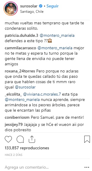 Todo esto tras las confesiones de la ex Miss Chile el pasado 2 de octubre en sus historias de Instagram donde llorando confesó estar cansada del hostigamiento que ha recibido por casi un año. Por lo que dijo Camila en los vídeos, sus seguidores no dudaron en sacar sus propias conclusiones apuntando a Solar como culpable.