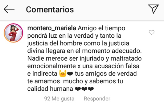 Y en ese mismo mensaje recibió un mensaje de apoyo de la modelo y actriz trasandina, Mariela Montero, que escribió: “El tiempo pondrá luz en la verdad y tanto la justicia del hombre como la justicia divina llegará en el momento adecuado. Nadie merece ser injuriado y maltratado emocionalmente por una acusación falsa e indirecta. Tus amigos de verdad te amamos mucho y sabemos tu calidad humana”.