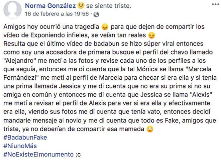 "Resulta que el último vídeo de Badabun se hizo súper viral, entonces como soy una acosadora de primera, busqué el perfil del chavo llamado 'Alejandro'", escribió la usuaria en Facebook.