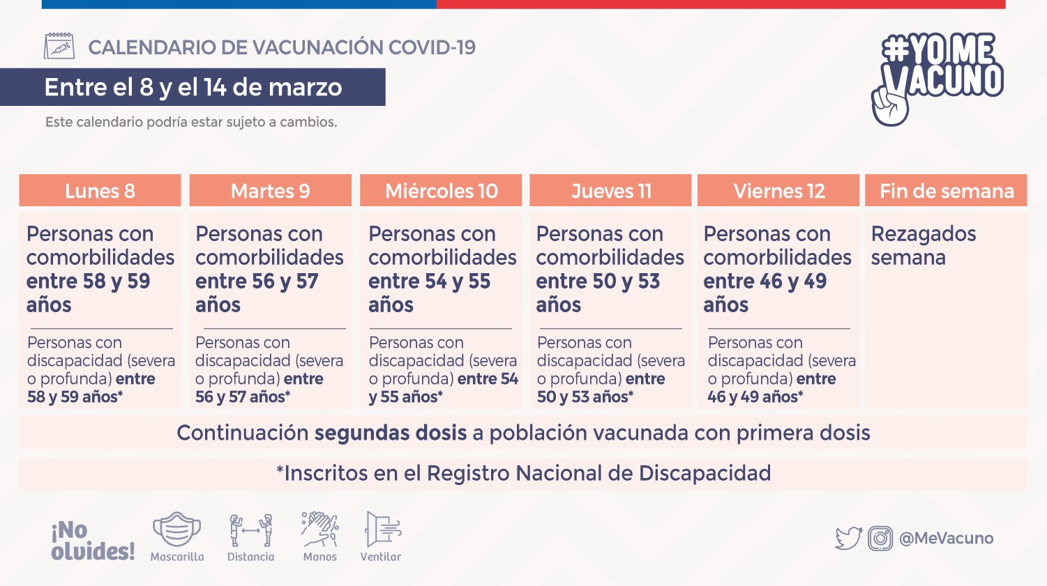 El Minsal reveló el calendario de vacunación para la próxima semana. Es decir, desde el lunes 8 hasta el viernes 12 de marzo, que incluye personas con comorbilidades y personas con discapacidad severa o profunda, de entre 46 y 59 años.