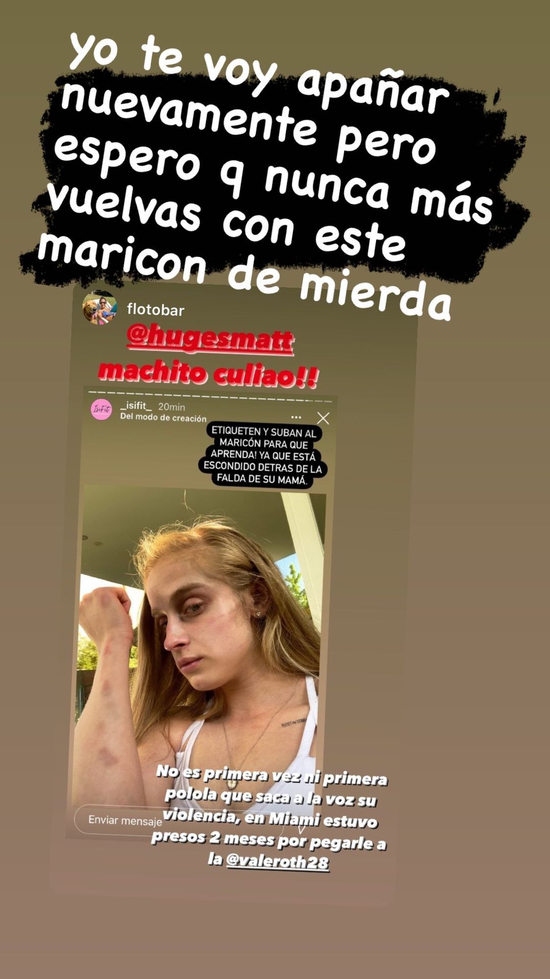 “Ese Matías que le pegó a la Isidora, sí, fue un ex del 2014, 2013 que a mí me pegó en Miami y lo metieron preso altiro. Dos meses estuvo preso en Miami (...) Y ahora se lo hizo a la Isidora, que tiene 22 años… bueno, da lo mismo la edad. Yo creo que con ella ya son 3 pololas que lo han denunciado”, comentó la bailarina.