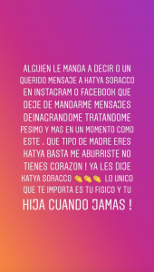 Hoy, y por medio del Instagram de Roth, vimos cómo la exgimnasta recibió mensajes de su madre, quien según ella misma, le causaron malestar. “Alguien le manda a decir o un querido mensaje a Katya Soracco en Instagram o Facebook que deje de mandarme mensajes denigrándome, tratándome pésimo y más en un momento como este", publicó Roth en una de sus historias.